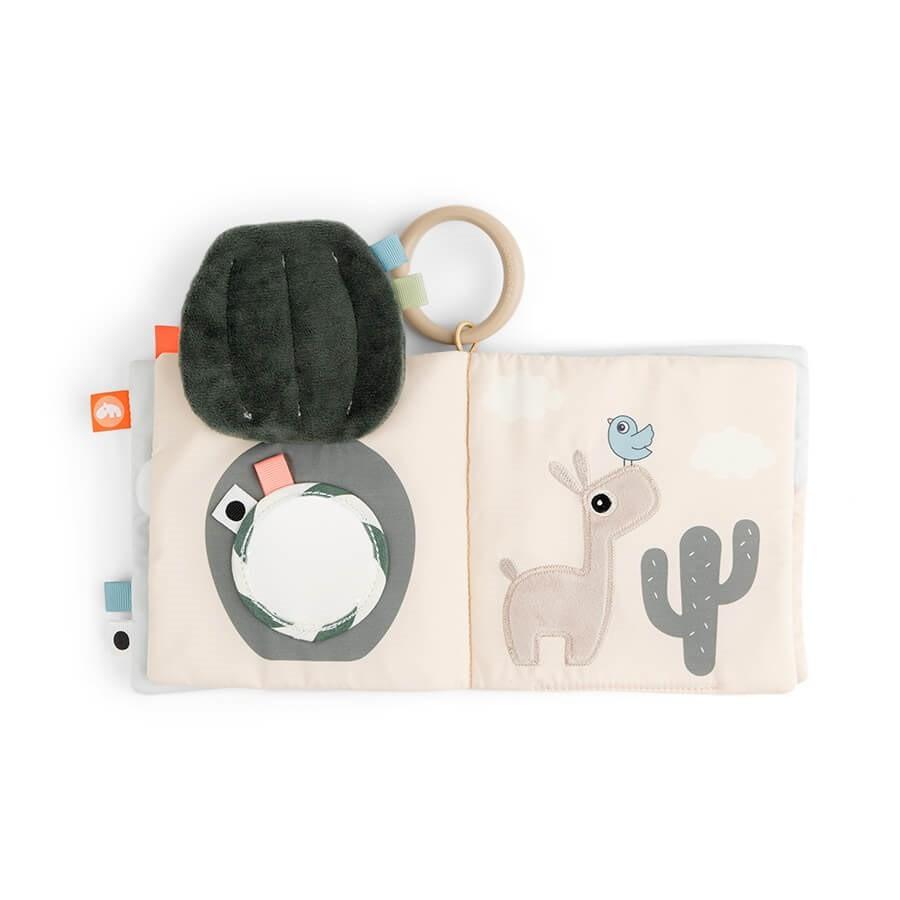 Rustige, zanderige kleuren worden gecombineerd met stoffig cactusgroen en een vleugje fris koraalrood. Gebruik de speelgoedkoppeling om het babyboek aan een speelmat te bevestigen voor een buikje of een wandelwagen, kinderwagen of autostoeltje voor vermaak.