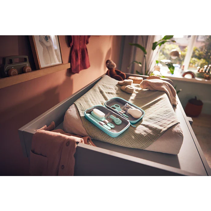 In de stevige en georganiseerde opbergdoos vind je onder andere een zachte neusaspirator die helpt de luchtwegen van je baby vrij te maken, een vingertandenborstel waarmee je het tandvlees zachtjes kunt masseren, en een nagelset met afgeronde schaar, nagelknipper en vijltjes. Voor de haartjes is er een zachte borstel en kam met afgeronde uiteinden – veilig en comfortabel voor de gevoelige babyhoofdhuid.
