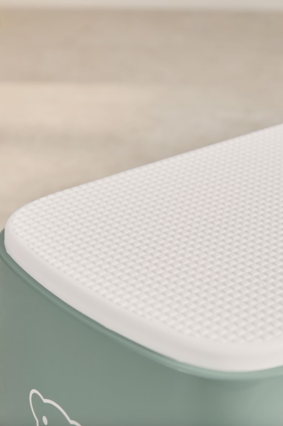 Wat dit opstapje onderscheidt, is de combinatie van veiligheid en design. Het antislip rubberen oppervlak zorgt voor stevige grip, zelfs wanneer de voetjes nat of onrustig zijn. De brede basis voorkomt wiebelen en verhoogt de stabiliteit. Bovendien is het opstapje vervaardigd uit hoogwaardig, BPA-vrij plastic dat streng getest is op schadelijke stoffen — volledig veilig volgens de Europese én Amerikaanse normen.