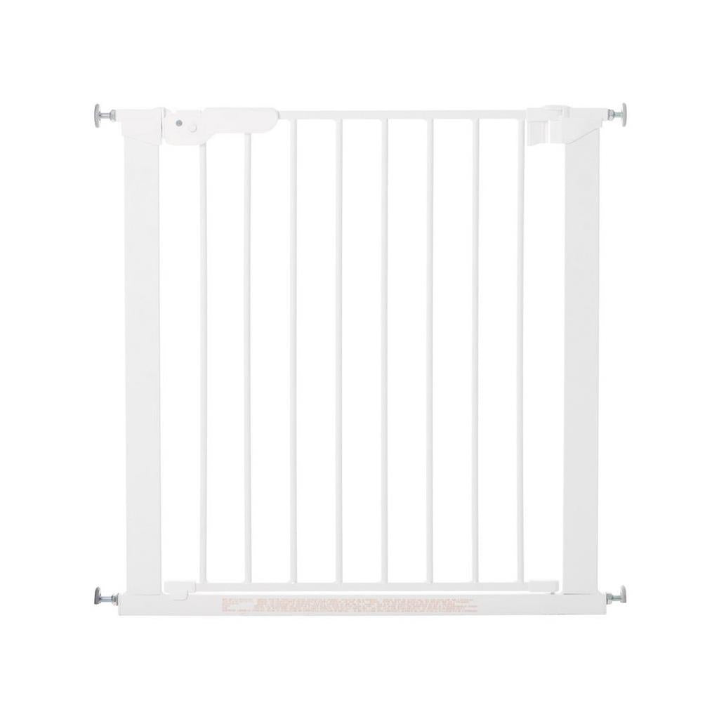 Het hekje is vervaardigd uit poedergecoat staal en polyethylene en heeft een moderne, discrete uitstraling die in elk interieur past. Dankzij het drukmontagesysteem blijft je muur intact, en kun je het hekje eenvoudig installeren en verwijderen. De deur opent naar beide kanten en kan met één hand worden geopend – handig als je je kindje of spullen draagt.