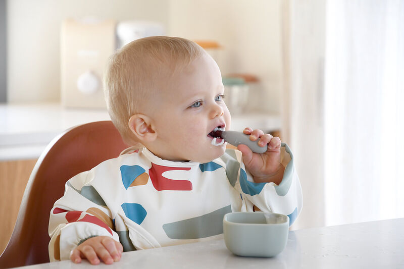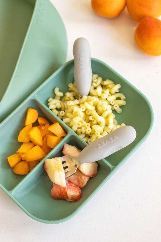 De combinatie van roestvrij staal (voor de vork en lepel) en een zacht siliconen handvat biedt het beste van twee werelden: duurzaamheid, veiligheid en een comfortabele grip. Het handvat heeft strategische inkepingen en een ergonomische vorm die geschikt is voor verschillende ontwikkelingsfasen van grip: palmgreep, vuistgreep of pincetgreep.