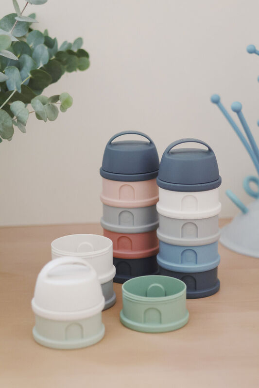 De Béaba Melkpoederverdeeldoos in Mineral Grey en Pink is een handige en praktische oplossing voor het doseren en bewaren van babymelkpoeder.