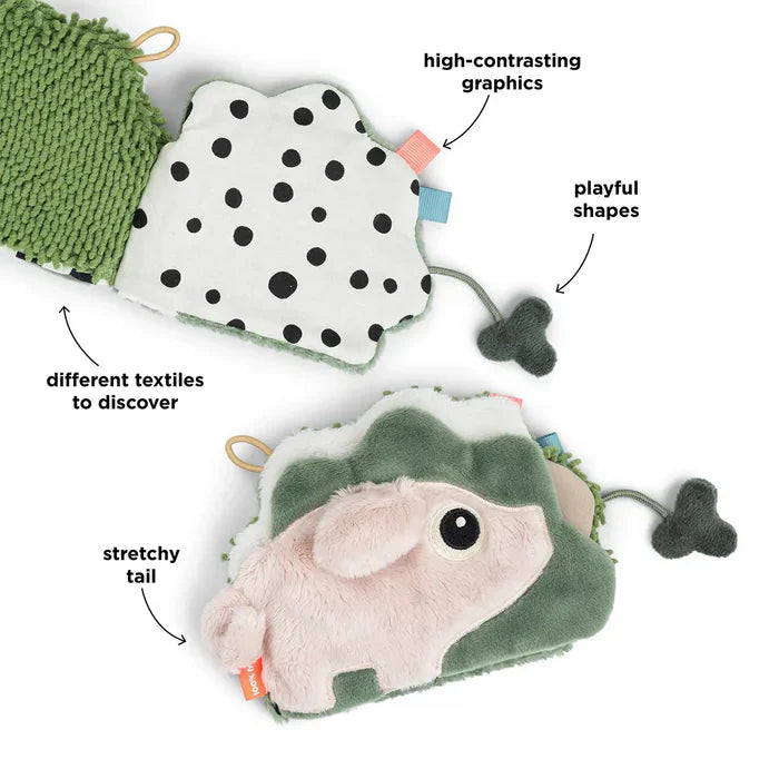 Dit speelse boekje zit vol verrassingen, zoals knisperende pagina’s, kralen en verschillende texturen, die het gehoor en de tastzin van je kleintje prikkelen. Laat je baby ontdekken wie zich achter de bosjes verstopt en geniet van de vrolijke hertenvriendjes die voor eindeloos speelplezier zorgen. De elastische lus met speelgoedlink maakt het eenvoudig om het boekje te bevestigen aan een kinderwagen, autostoel of speelboog.