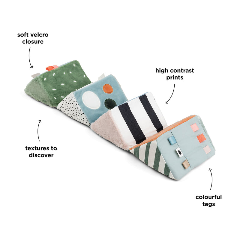 De verschillende texturen, speelse Deer Friends, kleurrijke prints, vormen en labels inspireren tot verkenning. De levendige kleuren en contrasten verbeteren de visuele stimulatie, terwijl het knisperende papier intrigerende geluiden biedt. Deze uitvouwbare sensorische kubus is perfect voor buikligging, kruippraktijken of zittend spelen. Gebruik de klittenbandsluiting om de kubus te sluiten en verander hem in een motiverende dobbelsteen.