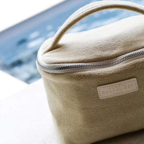 Gemaakt van zacht, absorberend badstofmateriaal in een tijdloze beige kleur, combineert deze toilettas functionaliteit met een verfijnde uitstraling. De tas is stevig afgewerkt met een duurzame metalen ritssluiting en een subtiel geborduurd label aan de binnenzijde, wat zorgt voor een luxueuze touch.