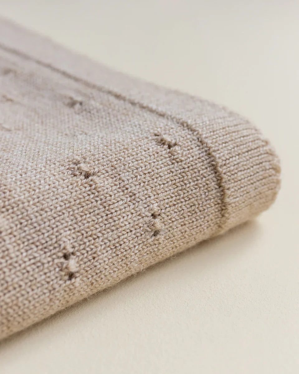Met zijn tijdloze Sand-kleur en verfijnde breistructuur past de Bibi-deken moeiteloos in elke kinderkamer of woonkamer. De natuurlijke elasticiteit van de wol maakt de deken comfortabel en flexibel, terwijl het gebruik van hoogwaardige materialen zorgt voor duurzaamheid en vormvastheid.