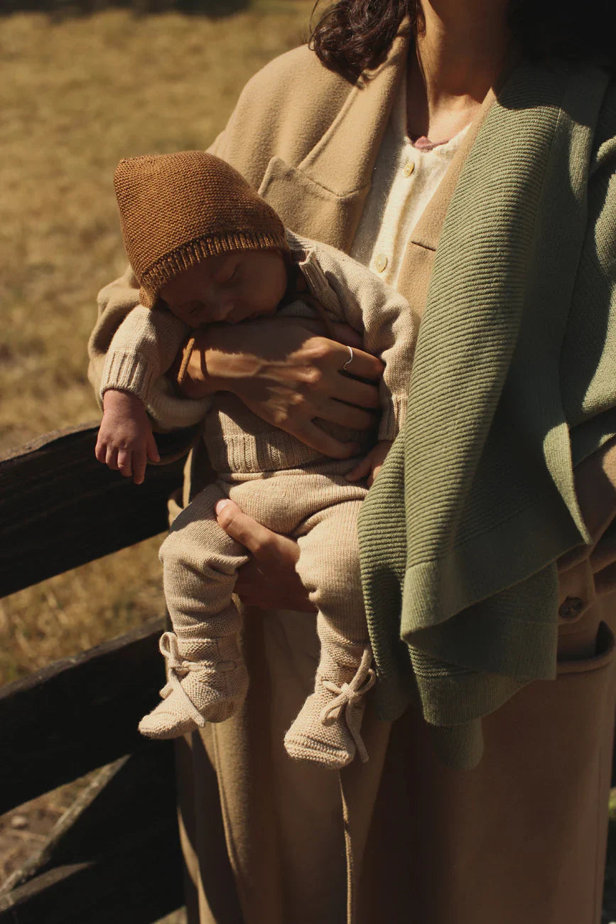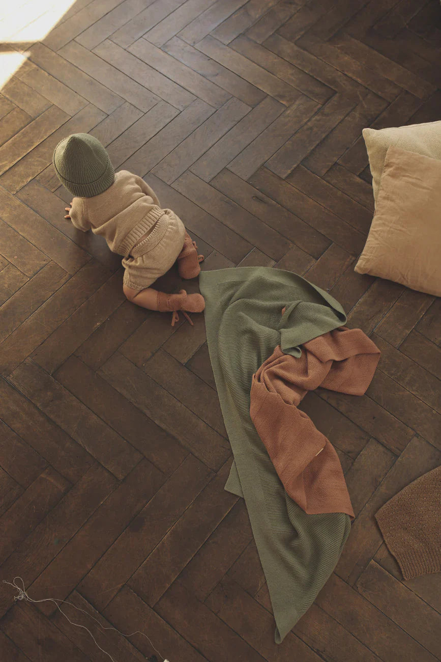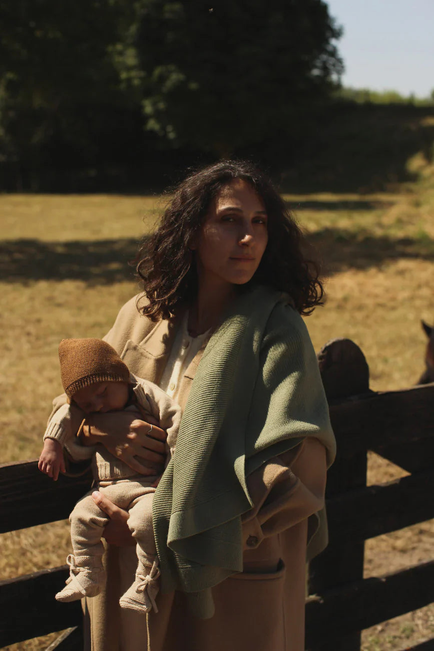 Het Gust deken van Hvid in de kleur Artichoke is een must-have voor de allerkleinsten. Speciaal ontworpen als eerste deken voor je pasgeborene, combineert het een luchtige breiwijze met een comfortabel, zwaar gevoel. Dit unieke evenwicht zorgt voor een kalmerend effect en een diepe geborgenheid – ideaal voor dutjes en rustmomenten.