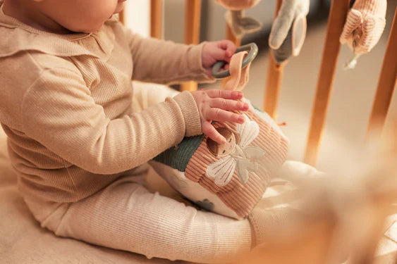 De kubus is rijk aan details: van kleurrijke opdrukjes en schattige printjes tot gevoelige tags en verfijnde geborduurde koordjes die nieuwsgierige handjes uitnodigen om te voelen, grijpen en verkennen. De verschillende structuren en vormen stimuleren zowel de tastzin als het zicht en de fijne motoriek van je baby.