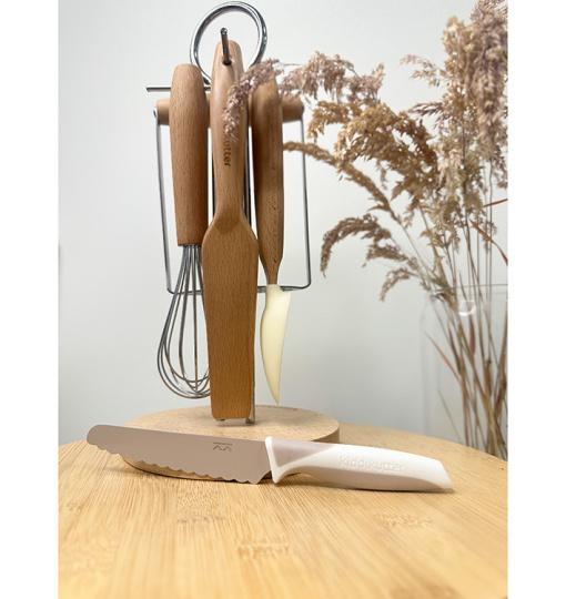 Het Kiddikutter kinder mes in de kleur Cream is speciaal ontworpen voor kinderen vanaf 3 jaar om veilig mee te helpen in de keuken.