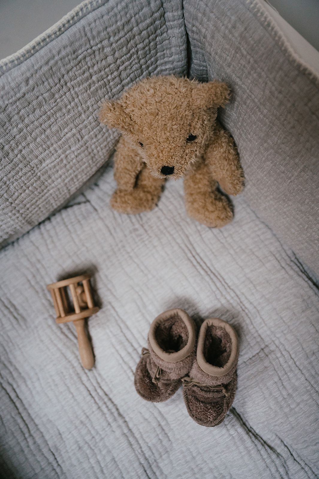 De buitenstof is gemaakt van Rivoli: een hoogwaardige chenille van 100% katoen met een elegante uitstraling en hoge aaibaarheidsfactor. De kleurcombinatie van Stone (koelgrijs) en Warm White zorgt voor een rustige, tijdloze sfeer die prachtig combineert met neutrale of aardse tinten in zowel baby- als woonkamers.