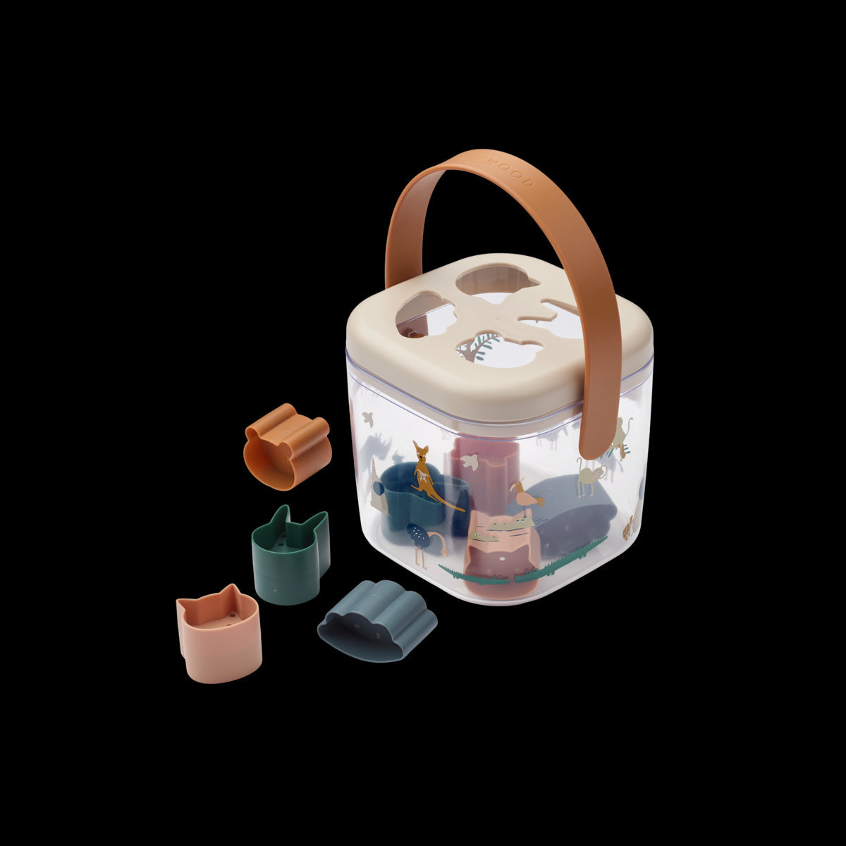 Het deksel heeft verschillende vormgaten waarin de bijgeleverde vormen precies passen. Elk puzzelstukje dient bovendien als mini-zeef, wat zorgt voor extra speelwaarde – ideaal voor gebruik met zand, water of ander sensorisch materiaal. De doos is voorzien van een afneembaar handvat en deksel, waardoor hij makkelijk te dragen en op te bergen is.