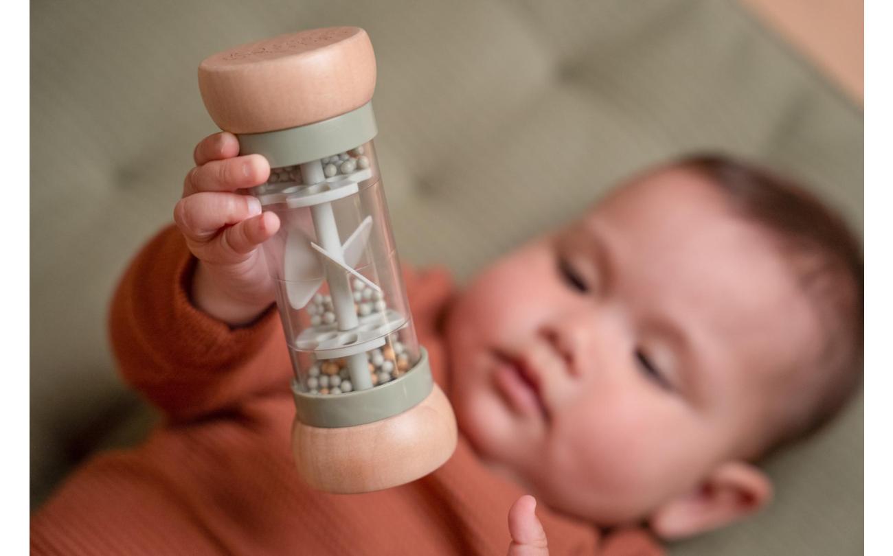 Wanneer je de rammelaar omdraait, vallen de kleurrijke balletjes door kleine openingen en laten ze een propeller draaien, waardoor het geluid van vallende regendruppels ontstaat.