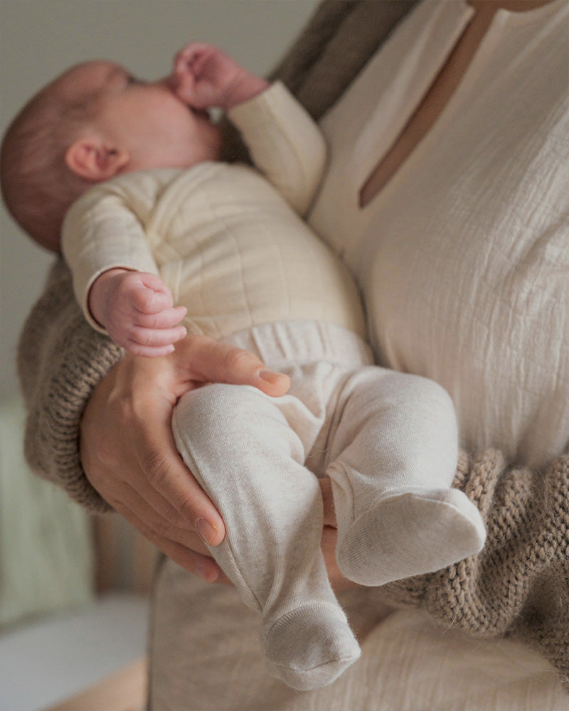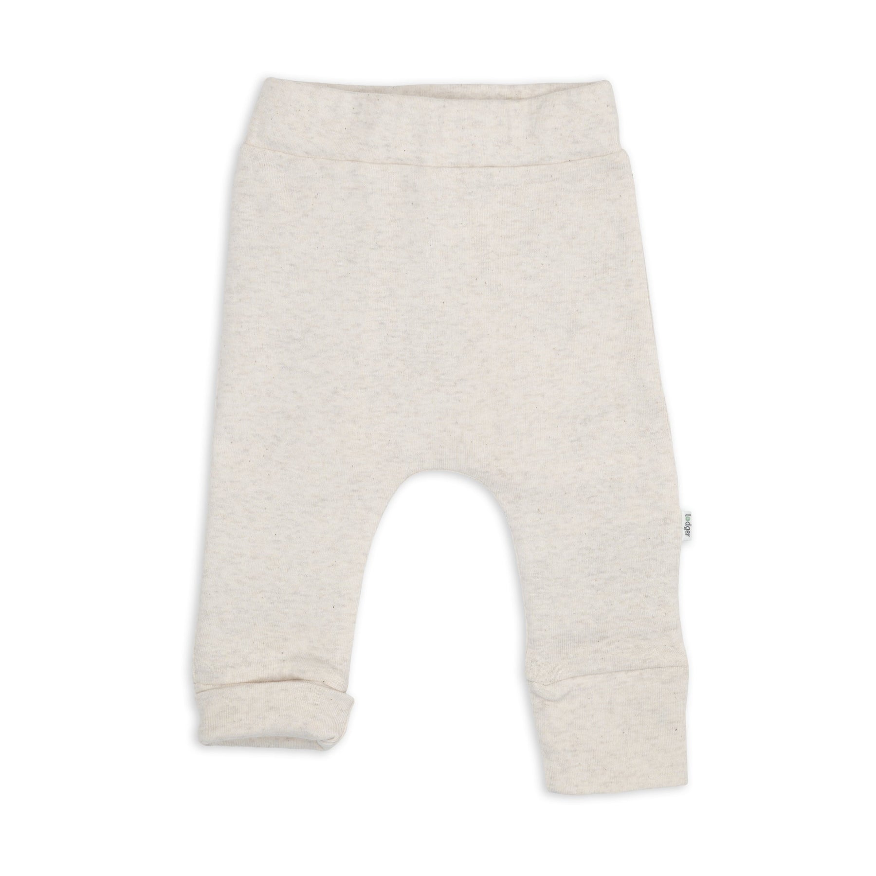 In maat 50 is de broek voorzien van geïntegreerde voetjes, zodat je baby altijd warme voetjes houdt, zonder losse sokjes. Voor de maten 56, 62 en 68 is er een slimme overslagboord voorzien aan de pijpen. Die vouw je eenvoudig om wanneer je baby groeit – waardoor het broekje langer meegaat.