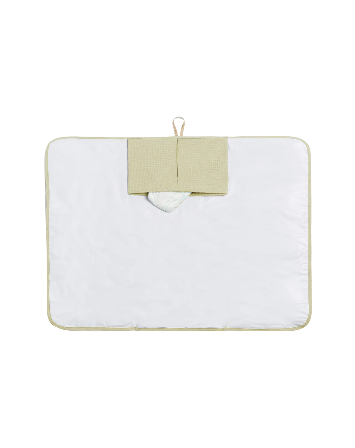 Het matje is gemaakt van biologisch katoen met een verfijnde honingraatstructuur en voorzien van een waterdichte voering, zodat je baby altijd zacht én droog ligt. Dankzij het compacte design en het gouden elastisch lint rol je het matje eenvoudig op tot een handig formaat dat in elke luiertas past.