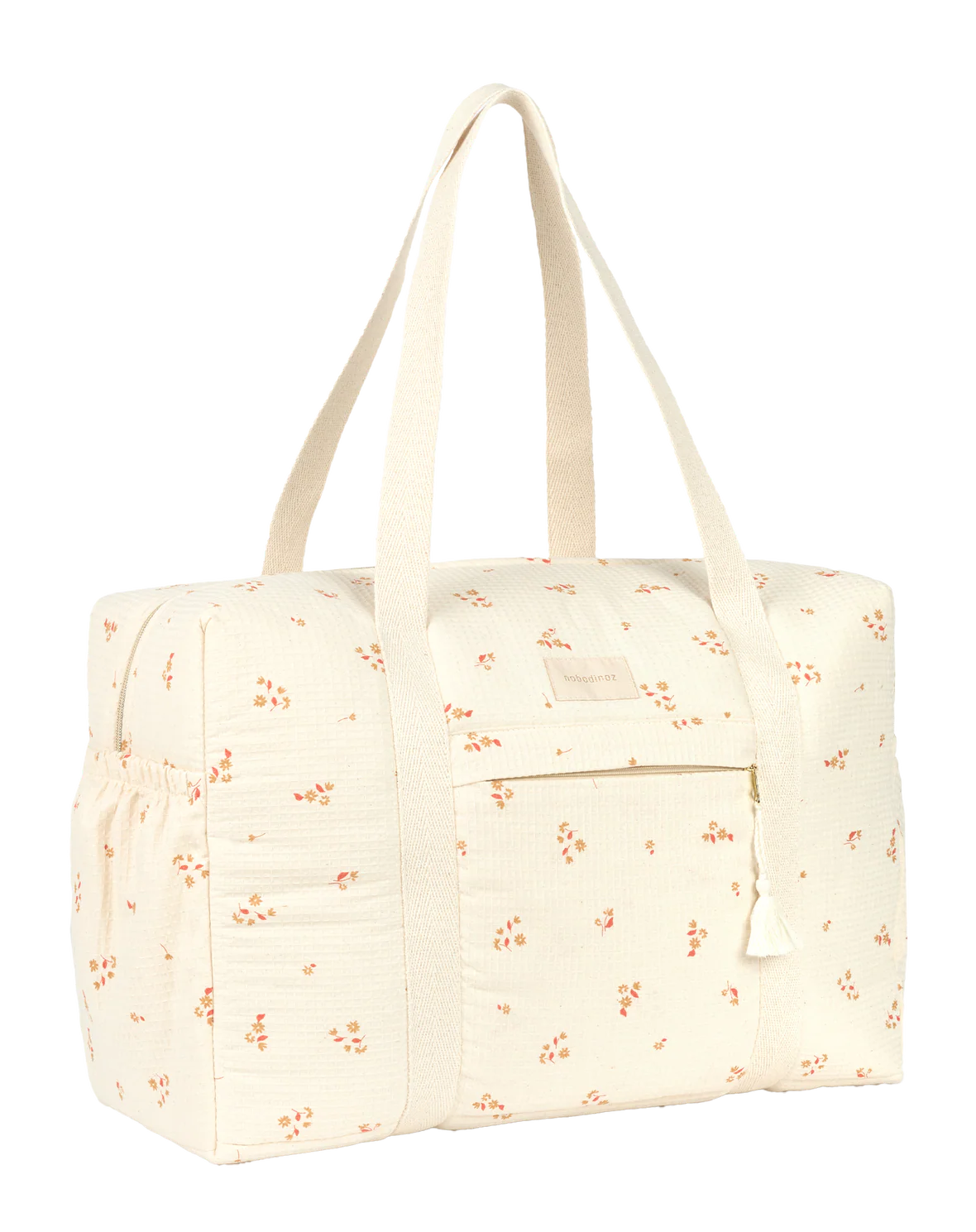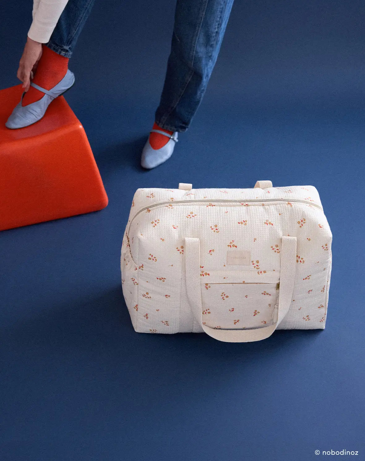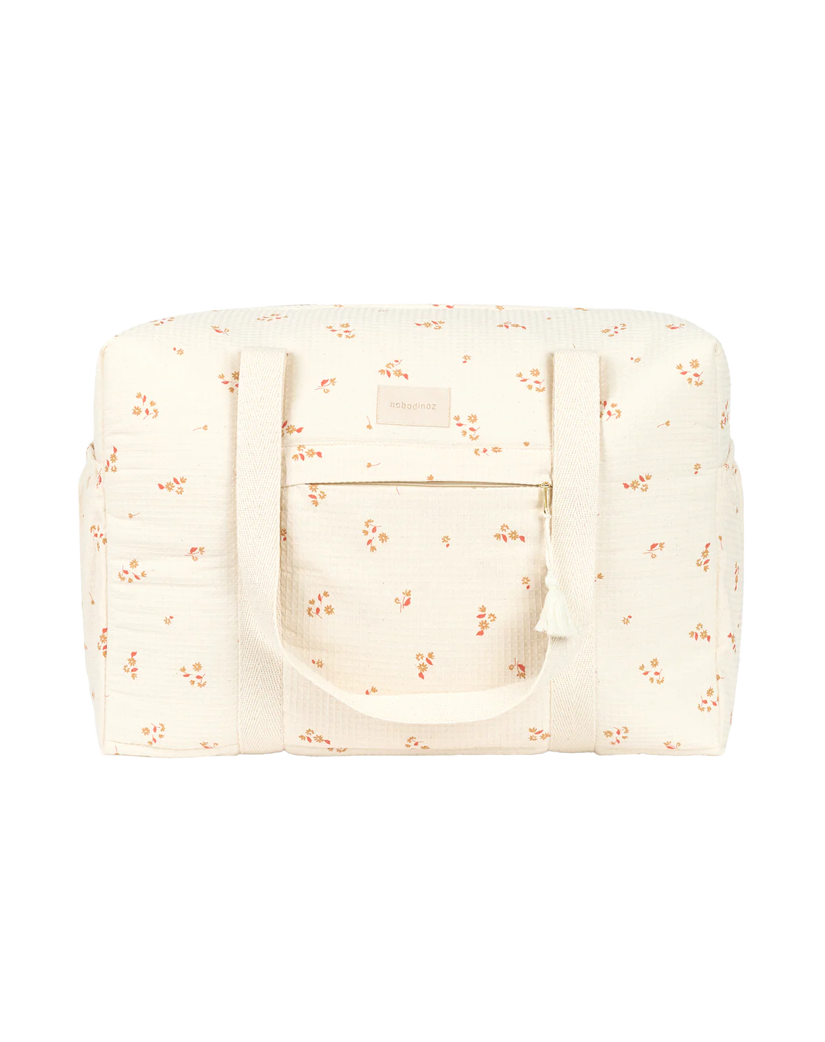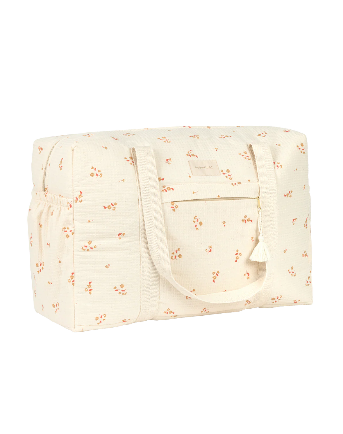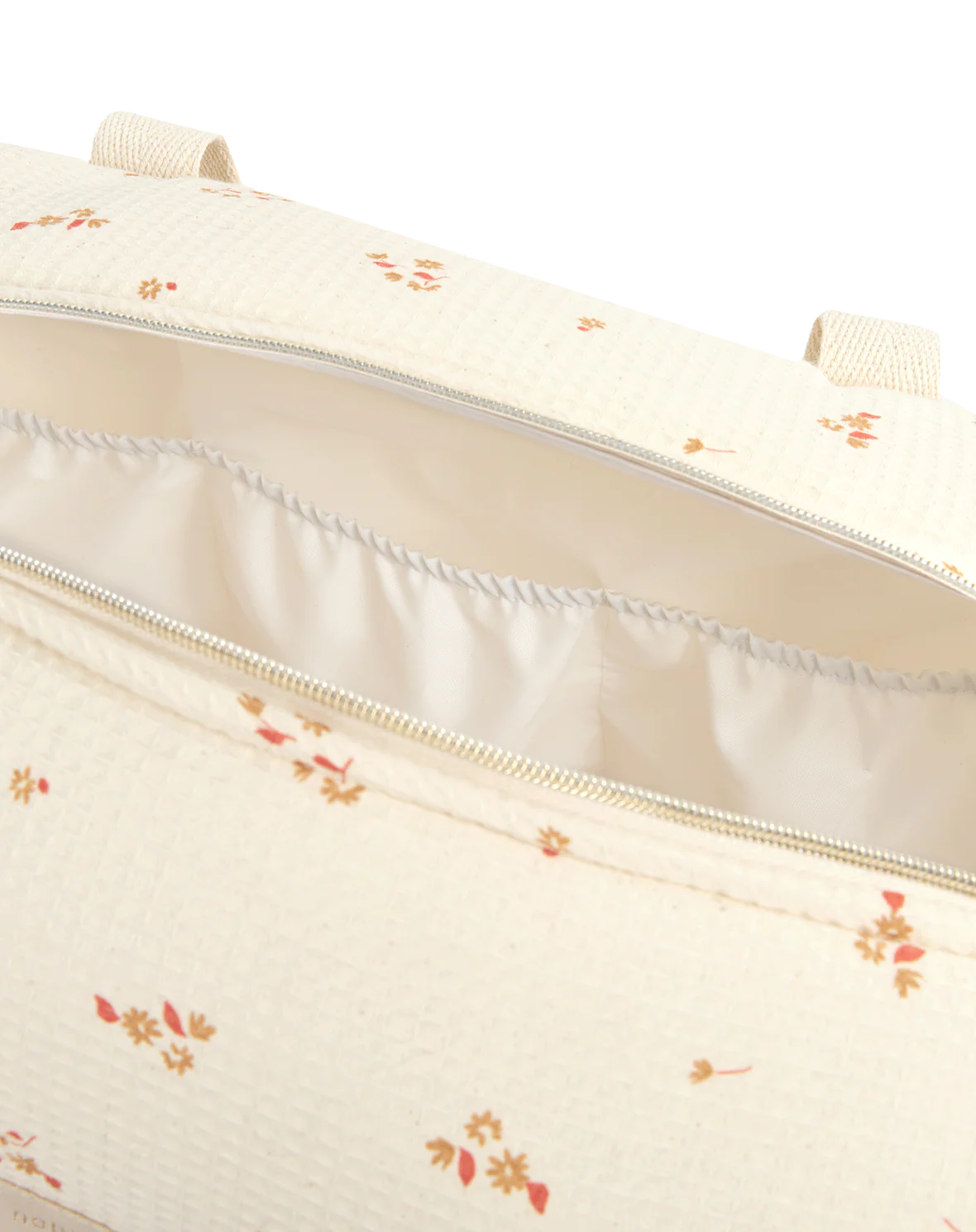 De geweven katoenen handvaten maken de tas comfortabel draagbaar, en de veilige ritssluiting zorgt ervoor dat alles stevig opgeborgen blijft. De tas straalt klasse uit met een zachte honingraattextuur en een speelse bloemenprint, wat een frisse en stijlvolle toets geeft aan je babyuitzet. Een échte musthave!
